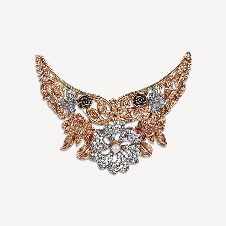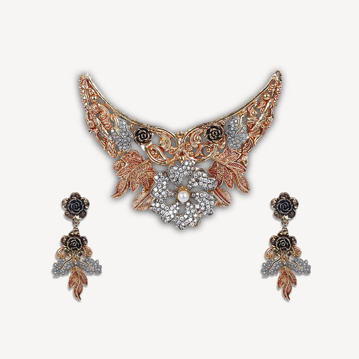 Noorsay “Blooming Radiance” Necklace Set. Antique Gold-Plated with Floral Design & White Zarqoon. Embrace the elegance of nature with the “Blooming Radiance” set by Noorsay. This enchanting necklace set features a delicate floral design set in antique gold plating, with sparkling white Zarqoon stones. The vintage-inspired gold finish combined with the brilliant white Zarqoon creates a stunning contrast, perfect for those seeking a sophisticated and timeless piece that radiates both luxury and femininity.