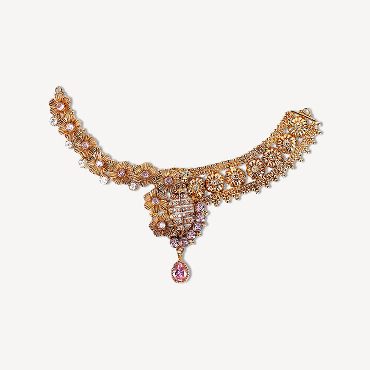 Elegant, graceful, and softly radiant — Noorsay Gulrosh is designed to capture the delicate charm of femininity. Adorned with blush pink stones and brilliant white zarqoon, this necklace set shines with a rich gold-plated finish that adds warmth and royalty to every detail.