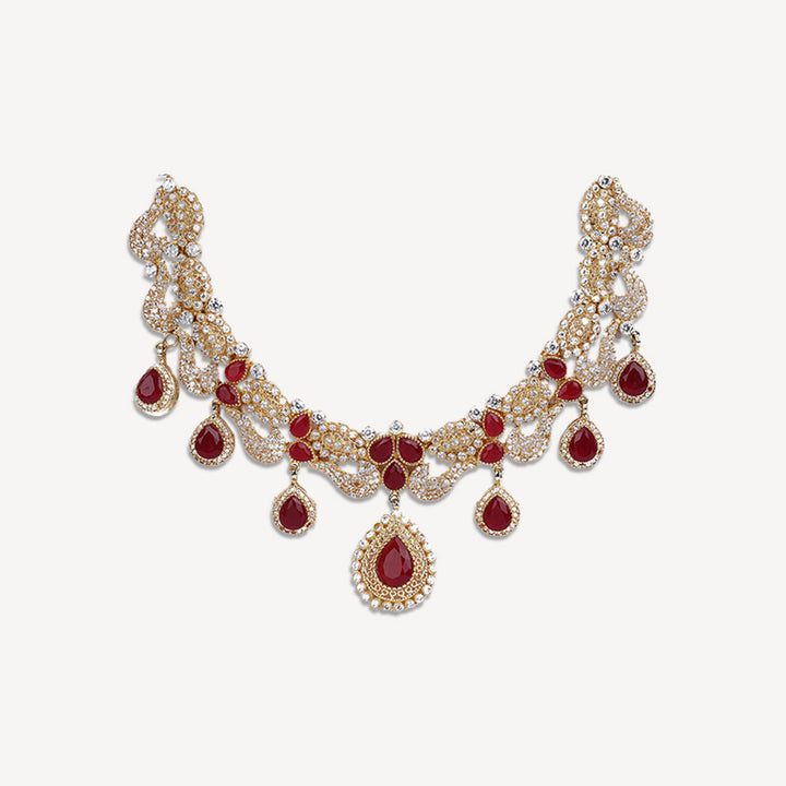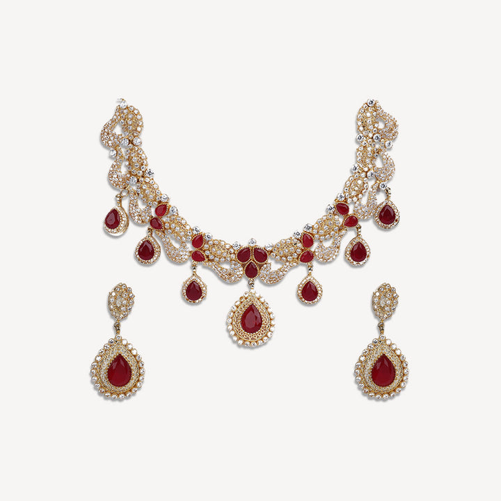 Noorsay “Crimson Radiance” Necklace Set. Gold-Plated with Red Stones and White Zarqoon. Discover the perfect balance of bold elegance and timeless beauty with the “Crimson Radiance” set by Noorsay. This striking design features gold plating, vibrant red stones, and the sparkling brilliance of white Zarqoon, creating a piece that exudes luxury and sophistication. Whether worn for a wedding, a gala, or any special occasion, this set will ensure you stand out with its radiant glow.