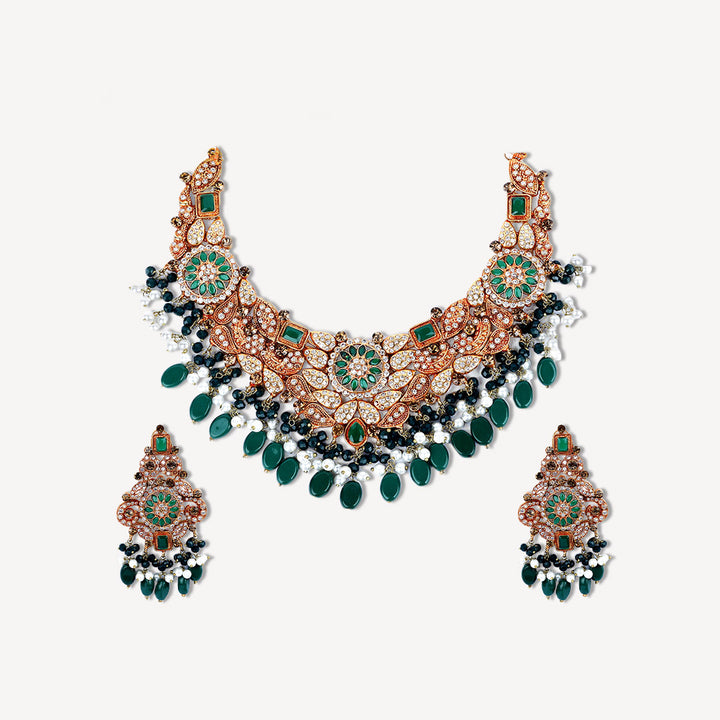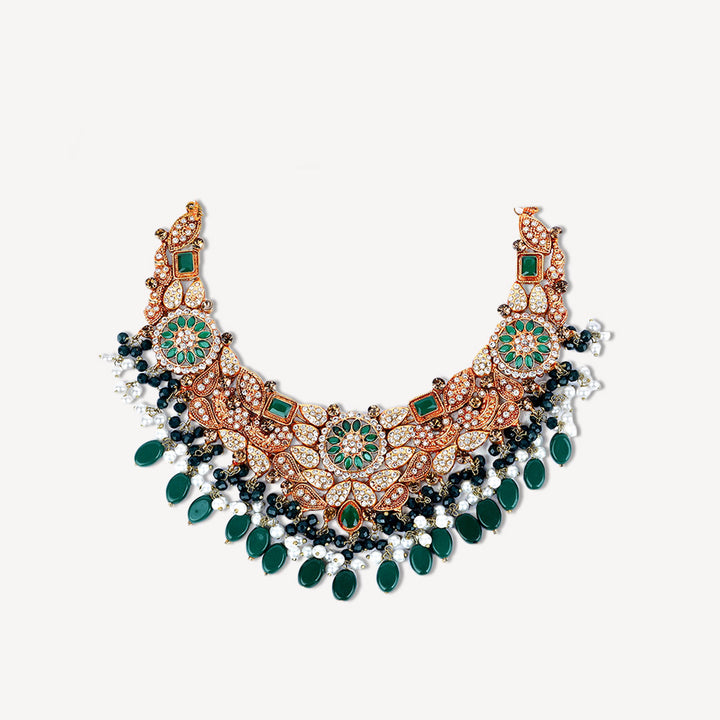 Step into a world of vibrant royal beauty with Noorsay Rang Mahal — a tribute to the colorful grandeur of palace life. The bold red and green stones sparkle like precious jewels from a royal courtyard, while shimmering white zarqoon adds a touch of refined brilliance. With its radiant gold-plated finish, this piece is made to turn every head.