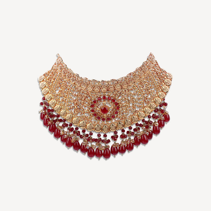Noorsay “Laal-e-Naz” Necklace Set Gold-Plated with Red Stones & Red Beads Bold, beautiful, and timeless, the “Laal-e-Naz” set by Noorsay combines the deep passion of red stones and red beads with the radiant warmth of 24-carat gold plating. This exquisite set is designed to make a statement, symbolizing love, vitality, and elegance in every detail.