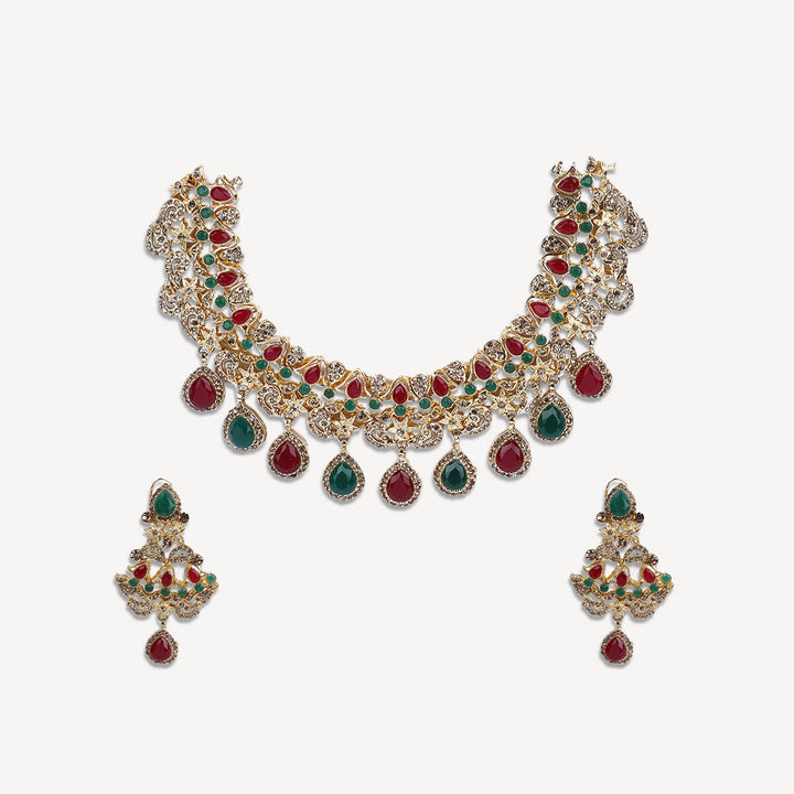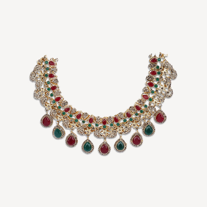 Noorsay “Noor-e-Rang” Necklace Set. Gold-Plated with Red & Green Stones and Champagne Zarqoon. Elevate your elegance with the “Zarqoon-e-Rang” set by Noorsay, a perfect fusion of vibrant hues and luxurious craftsmanship. Featuring gold plating, red and green stones, and the captivating shimmer of champagne Zarqoon, this set is designed to create an unforgettable impression. The bold color combination, paired with the delicate sparkle of Zarqoon, makes this set ideal for those seeking a statement piece that exudes both warmth and sophistication.