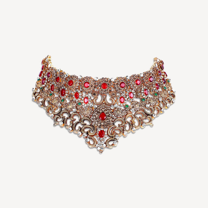 Noorsay “Rooh-e-Rang” Necklace Set Gold-Plated with Dominant Red, Subtle Green Stones & a Touch of White and Champagne Zircon A radiant celebration of color, soul, and craftsmanship — the “Rooh-e-Rang” set by Noorsay captures the beauty of tradition through a graceful fusion of bold red, gentle green, white sparkle, and champagne shimmer, all encased in a glowing 24-carat gold-plated finish.