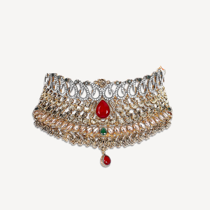 Noorsay “Royal Harmony” Necklace Set. Gold-Plated with Red, Green & Champagne Stones with White Zarqoon. Elegance in every element — the “Royal Harmony” set by Noorsay is a stunning fusion of bold red stones, accented by delicate green and champagne tones, all brought to life with shimmering white Zarqoon on a graceful gold-plated base. This rich and regal design reflects tradition with a contemporary sparkle, perfect for statement-making moments.