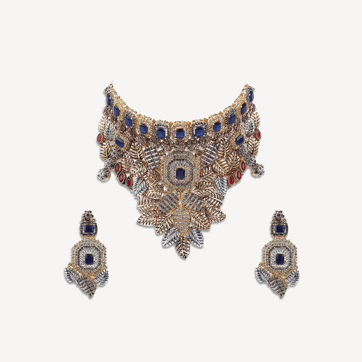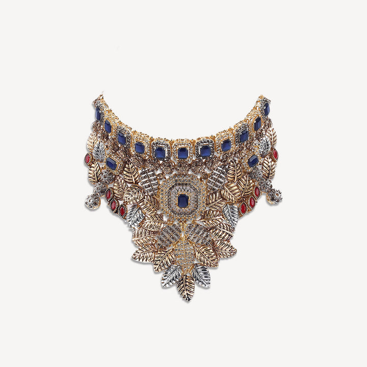 Noorsay “Sham-e-Noor” Necklace Set Gold & Silver-Plated with Blue & Red Stones, Touch of White & Champagne Zarqoon Radiating sophistication and charm, the “Sham-e-Noor” set by Noorsay combines the brilliance of gold and silver plating with the captivating hues of blue and red stones, enhanced by the sparkle of white and champagne Zarqoon. A stunning balance of bold and delicate, this set is designed to shine in every light, making it perfect for the modern woman who appreciates luxurious versatility.