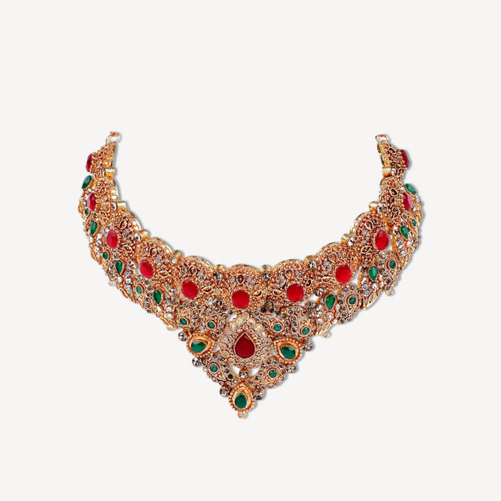 Its regal combination of colors adds depth and sophistication, making it perfect for bridal looks, festive events, or statement occasions. Every stone is hand-set to reflect grace and timeless allure.