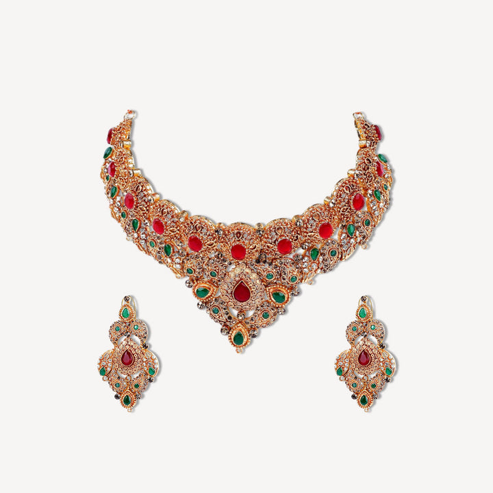 A celebration of color and light, Noorsay Zeenat is a radiant expression of classic beauty. This luxurious set features a rich gold-plated base, elegantly adorned with a captivating mix of deep red and green stones, complemented by champagne-toned and white zarqoon for a soft, glowing sparkle.