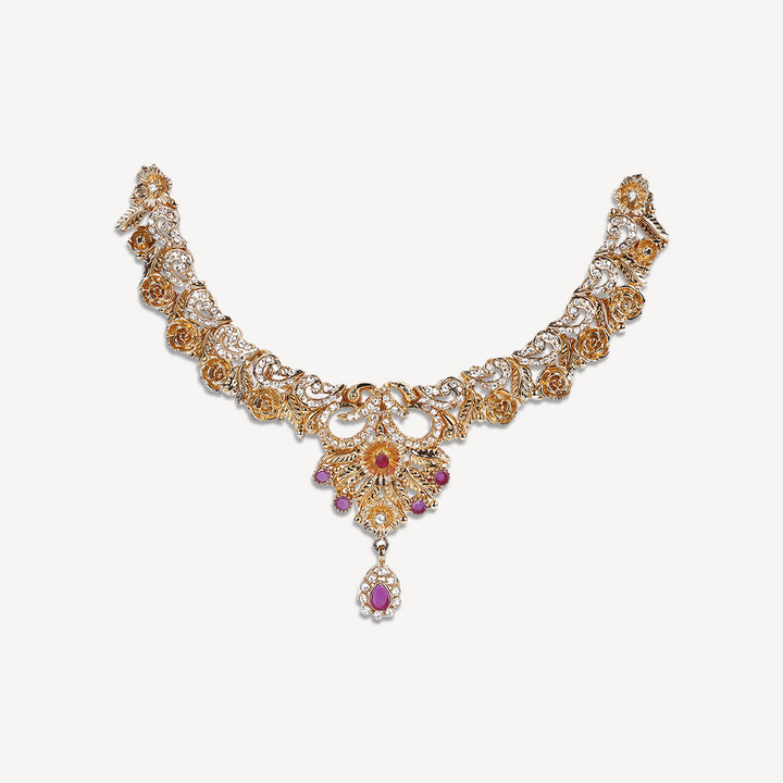 Noorsay “Violet Dream” Necklace Set. Gold-Plated with Purple Stones & White Zarqoon. Step into a world of luxury and enchantment with the “Violet Dream” set by Noorsay. This captivating jewelry set features rich purple stones paired with brilliant white Zarqoon, all set in radiant gold plating. The striking contrast between the deep purple stones and the sparkling white Zarqoon creates a mesmerizing effect, making this set perfect for those seeking an elegant, bold, and timeless look.